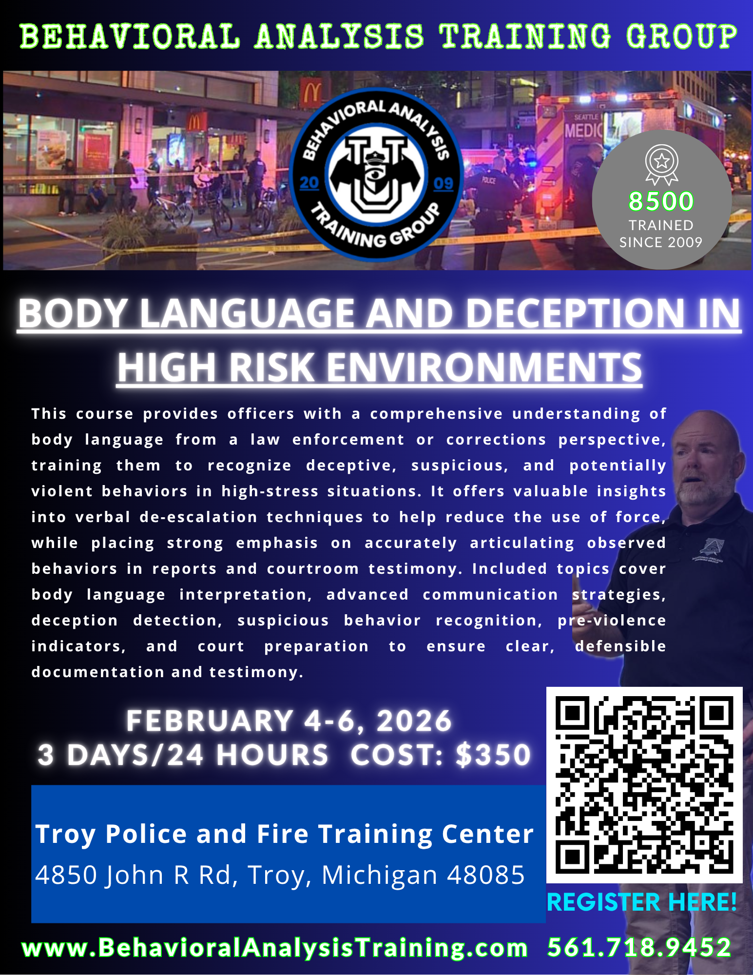 We’re excited to have you join us for an engaging and interactive five-day training that dives deep into the essential skills of body language reading, deception detection, suspicious behavior recognition, and pre-attack indicators.